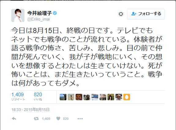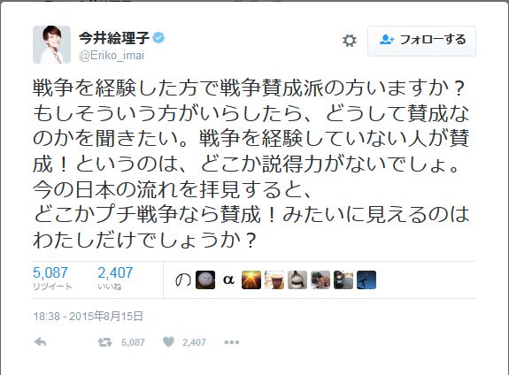 【1年前(8月15日)のツイート】今井絵里子議員「今の日本の流れを拝見すると、 どこかプチ戦争なら賛成!みたいに見えるのはわたしだけでしょうか?」