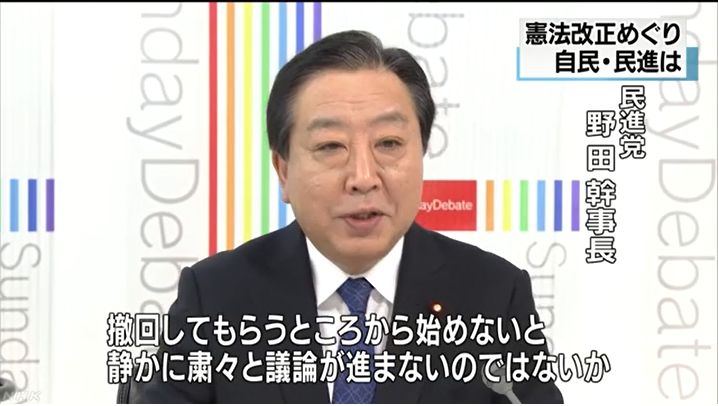民進“憲法改正草案撤回を” 自民“撤回しない” | NHKニュース https://t.co/Ehs78Wibsf 日曜討論を見ていてかねがね自民党の改憲草案は今の日本にそぐわないと呟いたが、野田民進党幹事長も「国民を軽んじ国のあり方を変える」草案は捨てるべきと放った。