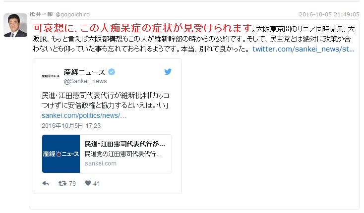 維新の松井一郎の、民進党江田氏に対する痴呆症決めつけツイートを見ていると、そりゃ長谷川豊みたいなのがはびこるわけだわと納得。