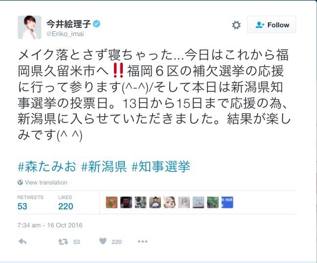 #自民党 #今井絵理子 議員の #公職選挙法 アウトなTweet。タグが「 #森たみお #新潟県 #知事選挙 」だもの。これは本文じゃないですよ。と言う言い訳は通らない。#クロス #モニクロ