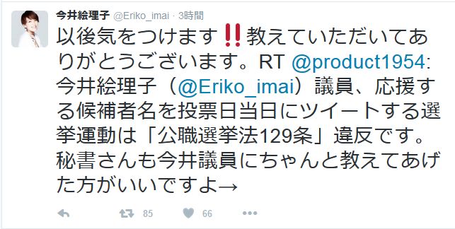 【エリちゃんは許される?】自民・今井絵理子議員に公職選挙法違反の疑い!投票日当日に応援ツイート⇒本人「以後気をつけます‼」と軽く謝罪。