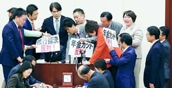 2016年11月26日(土) 年金カット法案も強行採決 衆院厚労委 自公と維新 4野党 差し戻し要求http://www.jcp.or.jp/akahata/aik16/2016-11-26/2016112601_02_1.jpg (写真)採決強行に抗議し委員長席に詰め寄る野党委員ら=25日、衆院厚労委 「年金カット」法案(国民年金法等改定案)について自民と公明、維新は25日の衆院厚生労働委員会で質疑を一方的に打ち切り、採決を強行しました。日本共産党と民進党は、午前中に参考人質疑を行ったばかりで法案の問題点も噴出しており、採決など論外だとして厳しく抗議しました。共産、民進、自由、社民の4野党の国対委員長は同日、大島理森衆院議長に対し、採決は認められないとして委員会に差し戻すよう申し入れました。 30日の会期末が迫るなかで4野党は、環太平洋連携協定(TPP)承認案とともに、「年金カット」法案は廃案にする以外にないと求めていく構えです。 「年金カット法案」は、(1)物価がどうなろうと賃金にあわせて年金改定を行い、年金水準を引き下げる(2)年金を物価・賃金以下に抑制する「マクロ経済スライド」の未実施分を翌年度以降に持ち越して実施する―ことが盛り込まれ、際限のない年金削減を押し付ける内容です。 この日の質疑で日本共産党の高橋千鶴子議員は、“将来世代の給付確保のため”という政府の言い分はまやかしだと追及。安倍晋三首相は「物価の伸びほど年金は上昇しない」などと認め、道理も大義もないことが浮き彫りとなりました。 与党は、午後に予定していた質疑が終了したところで突然、打ち切り動議を提案。野党委員が抗議するなか丹羽秀樹委員長の声がほとんど聞き取れないなかで、自民、公明、維新が法案の「採決」を強行しました。 採決後、衆院議員面会所では、委員会を傍聴していた年金者組合員の人たちが「年金受給者を敵に回す暴挙だ」と抗議。日本共産党議員団が激励に駆けつけ、組合員は「法案の問題点がはっきりした。参院で廃案に追い込もう」と声をあげました。 http://www.jcp.or.jp/akahata/aik16/2016-11-26/2016112601_02_1.html 2016年11月26日(土) 年金カット法案強行に抗議 4野党 衆院本会議上程許されない http://www.jcp.or.jp/akahata/aik16/2016-11-26/2016112602_01_1.jpg (写真)年金カット法案の採決強行をうけ共同で記者の質問に答える(左から)玉城、山井、穀田、吉川の各氏=25日、国会内 野党4党の国対委員長は25日、「年金カット法案」が衆院厚生労働委員会で強行採決されたことに抗議し、大島理森衆院議長に同法案を本会議に上程しないよう申し入れました。大島氏は「議院運営委員会や与野党間でしっかり話しあってください」と答えました。 申し入れ後、4党が会見。日本共産党の穀田恵二国対委員長は、参考人質疑をした当日に強行採決したことを批判。「歴代議長は国民の声を聞くのを大事にということを都度都度言ってきた。本会議上程は許されない」と述べました。 さらに中身が問題だとして、自民党も含め誰もが今の年金に問題があると認めていると指摘。「参考人も抜本的改革を求めているにもかかわらず、際限のない年金カットを国民に押し付けることは認められない。委員会に差し戻し、議論すべきだ。内容でも問題だし、国民の声を聞く点でも問題だ」と語りました。 民進党の山井和則国対委員長は「たった19時間の審議で強行採決するのは乱暴すぎる。審議を短くして国民に知らさないうちに成立させようとしている」と批判。「3週間前にもTPP(環太平洋連携協定)で強行採決をやった。1カ月の間に2度も強行採決。言論の府たる国会の形骸化になる」と語気を強めました。 自由党の玉城デニー国対委員長は「国民への十分な説明が不足している。総理答弁は答弁に値しない」と述べ、社民党の吉川元政策審議会長は「政府の答弁は聞かれたことに答えていない」と批判しました。 http://www.jcp.or.jp/akahata/aik16/2016-11-26/2016112602_01_1.html 2016年11月26日(土) 将来世代も水準低下 衆院委・高橋氏 首相認める http://www.jcp.or.jp/akahata/aik16/2016-11-26/2016112602_03_1.jpg (写真)質問する高橋千鶴子議員=25日、衆院厚労委 日本共産党の高橋千鶴子議員は25日の衆院厚生労働委員会で、年金カット法案は“将来世代の給付確保のため”と言う政府の言い分を突き崩し、「まずこれ以上の給付減と負担増をやめるべきだ」と述べ、法案の撤回を迫りました。 高橋氏が、年金の伸びを物価・賃金の伸び以下に抑えるマクロ経済スライドで「年金水準=購買力が下がるのは明確だ」とただすと、安倍首相は「物価の伸びほど年金は上昇しない」と認めました。 さらに高橋氏が、今回の改定でマクロ経済スライドの未実施分を持ち越すことや、賃金に合わせて改定するルール見直しによって「前年より年金水準が下がり、将来世代の水準も下がる」とただすと、安倍首相は「物価が上がっても賃金が下がれば、下がった賃金にスライドさせる」と述べ、将来水準の低下を認めました。 高橋氏は、現役男性の手取り収入の50%給付を維持すると言う主張についても、受給開始年以降にど