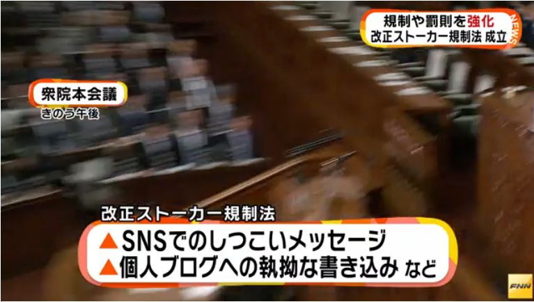 きょう、改正ストーカー規制法が衆議院本会議で全会一致で可決・成立。ブログやツイッターなどで執ようにメッセージを送る行為なども、ストーカー行為として規制する対象に含めることになりました。https://t.co/ELVF2dN68V
