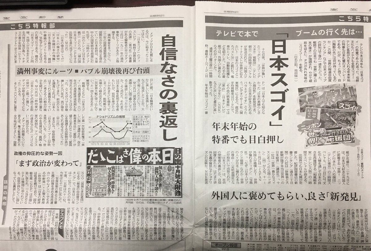 テレビで本で「日本スゴイ」ブームの行く先は…(東京新聞、12月23日)「言ってほしいことを確認することが目的になっている。自らを客観視できないことは非常に危険」「第一次安倍政権で『美しい国』が連呼され、改正教育基本法に『愛国心』が盛り込まれたことで」愛国心を強調する出版物が氾濫。 pic.twitter.com/XzJLxG8kAm