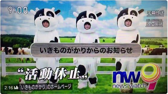 NHKニュースウォッチ9トップニュース「いきものがかり突然の活動休止‼」