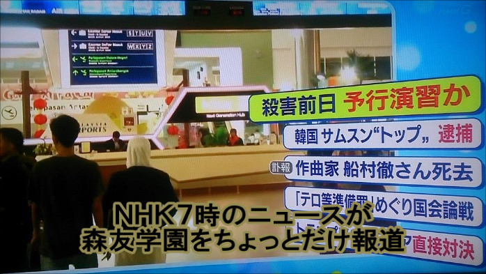 NHKの7時のニュース、トップが金正男の暗殺、2番目が韓国の疑獄。自分の国の政治腐敗には一切触れないのか。首相と親密な関係を誇る学校法人に国有地が格安で払い下げられ、校舎建設に国交省の補助金が付いた事件が腐敗でなくて何なのか。