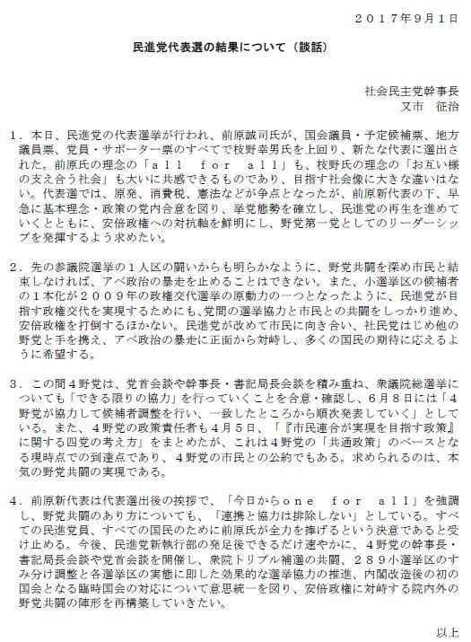 日本共産党の志位和夫委員長は1日、国会内で記者会見し、民進党の新代表に前原誠司元外相が選出されたことについて問われ、「前原新代表にお祝いのメッセージを送りたい。私たちとしては、野党と市民の共闘をさらに発展させるために、しっかりと話し合いを行っていきたい」と述べました。