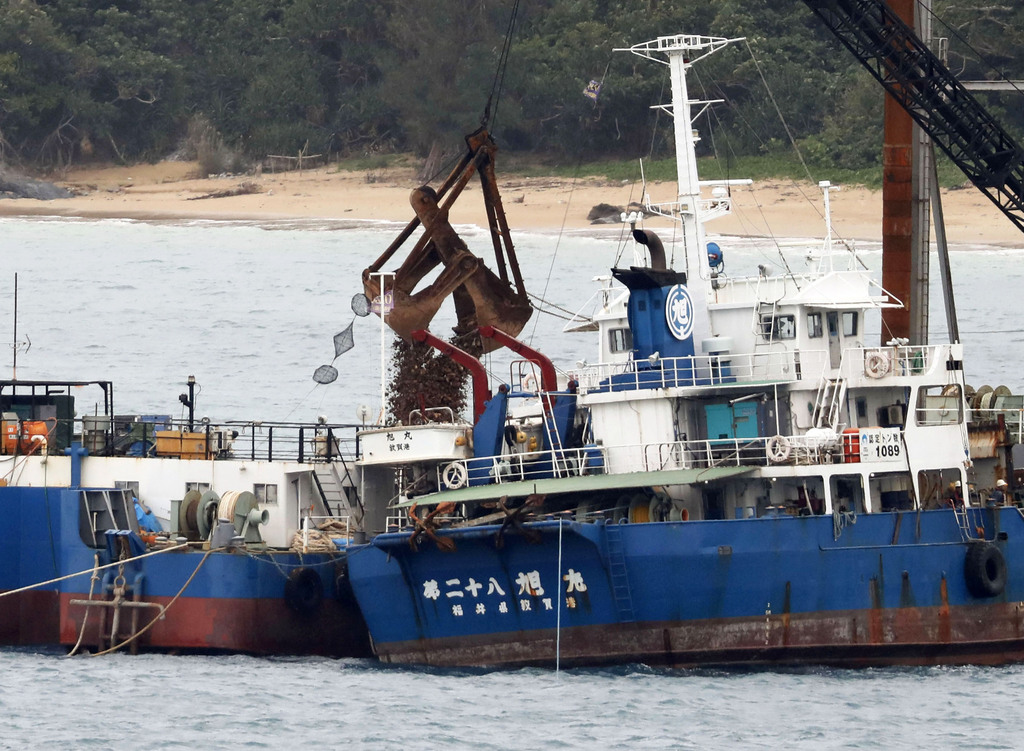 *沖縄県名護市辺野古沖で行われる、埋め立て用土砂を積んだ船(右)から別の運搬船への積み替え作業=12日午前https://s3-ap-northeast-1.amazonaws.com/newstopics-production/url/d22f206af2a8648cf0927f8e6f28d5fef4183514?1544611475