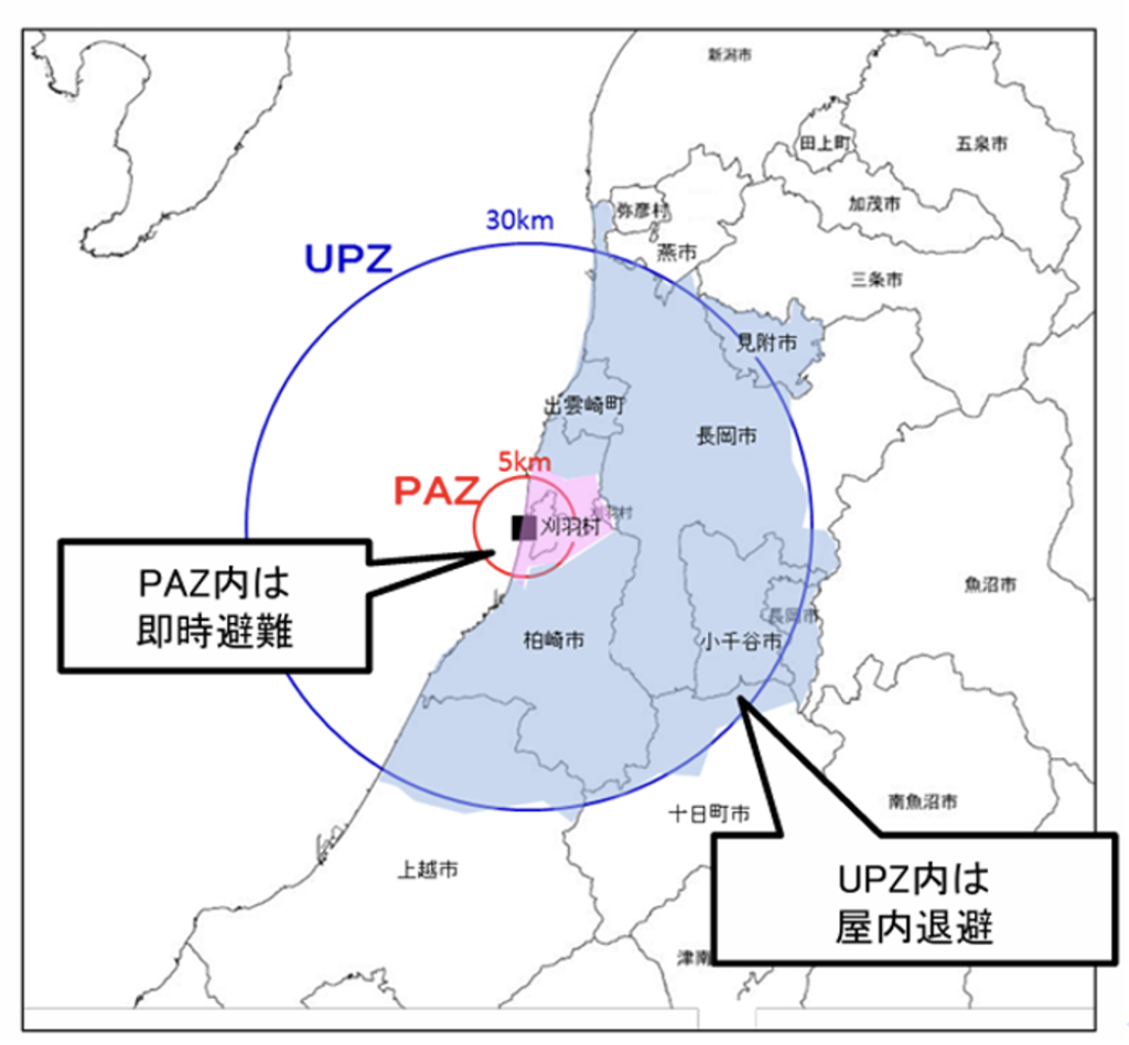 原発が冷却機能を喪失するような全面緊急事態になった場合、5q圏(PAZ)の住民は被ばくを避けるために、放射性物質が放出される前に、原則30q圏外に避難をすることになっている。一方、5〜30q圏(UPZ)の住民はひとまずは「屋内退避」となり、高線量が観測されたときにはじめて、避難指示が出される。20マイクロシーベルト/時に達したときは一週間程度を目途にした一時移転、500マイクロシーベルト/時に達したときには即時避難だ。基準自体がかなりの高線量だが、これは柏崎刈羽原発に限った話ではなく、前述の「原子力災害対策指針」で定められているので、すべての原発に適用されている。