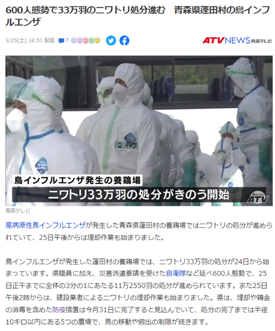 600人態勢で33万羽のニワトリ処分進む 青森県蓬田村の鳥インフルエンザ(ATV青森テレビ)
