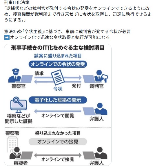 また、当連合会は、2023年(令和5年)7月13日、「市民の権利を保護・実現する刑事手続のIT化を求める意見書」を公表し、刑事手続のIT化を市民の権利を保護・実現する観点から進め、オンラインの活用による電子データの授受を含む接見交通権の拡充や、証拠開示のデジタル化による防御権及び迅速な裁判を受ける権利の実現を図ることを求めた。