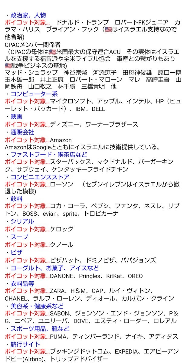 ボイコット対象… ドナルド・トランプ ロバートFKジュニア カラマ・ハリス ブライアン・フック(🇺🇸はイスラエル支持で他沢山居すぎなので省略)