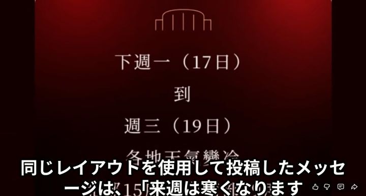 台湾の防災関連アカウントが、中国外務省と全く同じ赤背景、同じ字体、同じレイアウトを使用して投稿したメッセージは「来週は寒くなります。厚着をしてください」というものでした。威圧的なデザインで伝えられる平和な天気予報という強烈なギャップに、日台のネットユーザーたちは大爆笑。中国の威嚇は完全に笑いのネタへと変換されてしまったのです。
