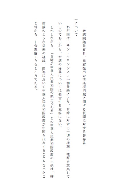 日本は「サンフランシスコ平和条約により、台湾に対する一切の権利・権限を放棄しているのであるから、台湾の帰属については発言する立場にはない」というのが政府の公式見解。中国の言い分は理解し得るので対話により平和的に解決することを期待する、という事。 質問主意書 答弁書第68回国会(No.14)