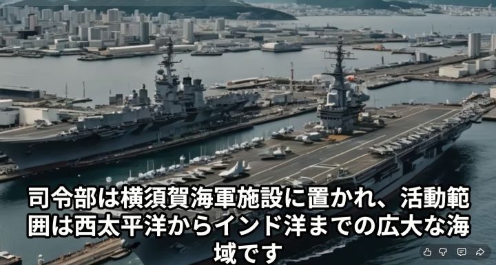第7艦隊は世界最強の艦隊で、横須賀を司令部とし、西太平洋からインド洋をカバー。戦時には50-60隻の艦艇、350機の航空機、6万人の人員を動員可能。