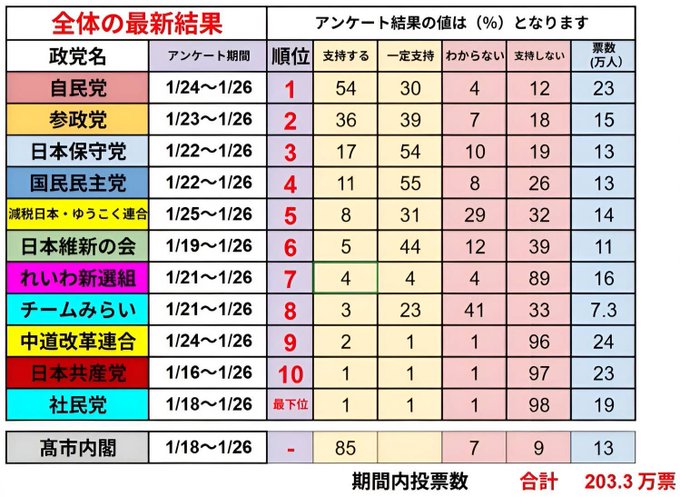 【YouTubeアンケート最終結果1/16-26】支持(投票予定)と答えた(%)