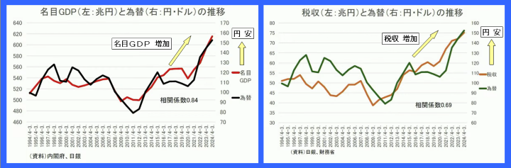 はい。ちょっとこれはちょっとやめて。すごくなんか批判がたくさん来てるし、23番目のやつは、図出して。これは為替がえっと円安になると名目GDPが伸びるってやつなんだよね。(上図左)これはこれでいいわけ。それで、あのあと税収も一緒に書いたんだけどこれ全くこれもいいわけ。(上図右)