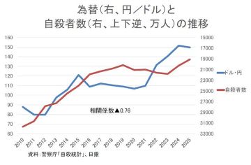 円安だと名目GDPが伸びる。これは古今東西○○として高校で習ったはず。名目GDPが伸びるので税収も伸びる。しかも外為特会で含み益ができ、税外収入も伸びるのは事実。増えた税収や税外収入をどのように国民に還元するかを議論すればいい。為替の力を甘く見ない方がいいよ。円安と自殺減は同時に来るし、円高と自殺増も同じだ。