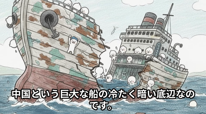 若者たちの沈黙も不気味だ。過去の危機ではデモがあったのに、今は「寝そべり族」を超え、自ら血筋を断つ決意をする。政府の「経済回復中」というプロパガンダの裏で、人々は血を売ったり個人情報を切り売りしたりして生き延びる。未来への希望が消え、ただ今日を生きる生存本能だけが残るこの帝国の沈没は、他国の物語ではなく、私たち日本や世界への警告だと強く思う。北京のネオンの裏から聞こえる嗚咽が止む日、巨大な崩壊を目撃するのかもしれない。(Grok)
