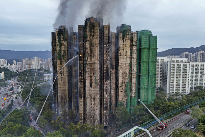 香港返還後、最悪のビル火災となった。住宅外壁の補修工事で設置された足場の網が燃えて延焼した疑いがあり、警察は過失致死容疑で、補修工事を請け負った会社の幹部の男ら3人を逮捕した。