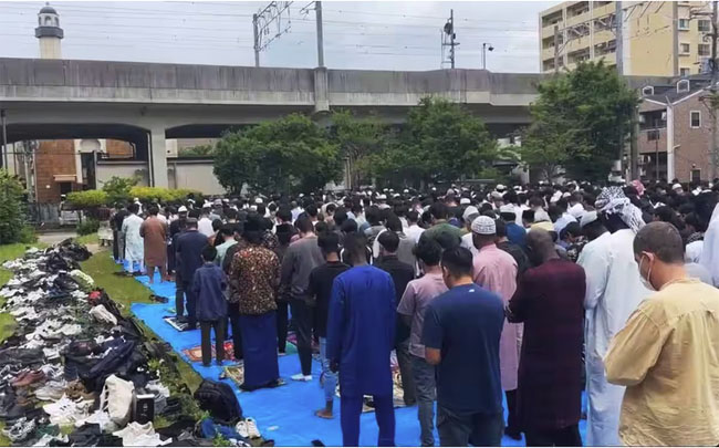 公園に敷き詰められたブルーシートに約600人のイスラム教徒がひざまずき、拡声器から流れる声に合わせて祈っていた。福岡市東区の福岡モスク(礼拝所)に入りきれない人が、隣接する公園にあふれた。