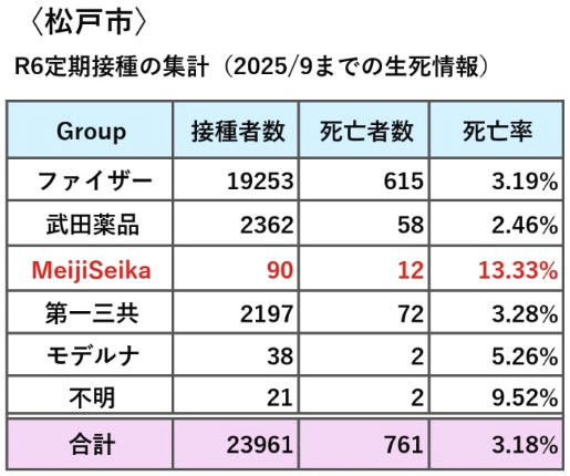 米国でのメタアナリシス(21,618,297人対象、2023年報告):非接種者の死亡OR=2.46(95% CI: 1.71-3.53)。つまり、非接種者が接種者の2.46倍死亡しやすい。感染者のうち、接種者が生存率を有意に向上させた。 *別のメタアナリシス(2022年、欧米中心):完全接種でCOVID-19死亡リスクを91-92%低減(HR=0.08-0.09)。オミクロン株下でも、ブースター接種で93%の有効性(VE)。 大規模コホート研究例: CDC(VISION/IVYネットワーク、2024-2025年、米国成人≥18歳):2024-2025更新ワクチン接種者は、非接種者に比べてCOVID-19関連死亡率が15-23倍低い(RR=15.2-23.7、特に65歳以上)。2023-2024年データでも、ブースター接種で死亡RR=10.3(≥80歳)。 英国ONSデータ(2022-2023年):非接種者の死亡率が接種者の8-24倍。高齢者で顕著。 【 非接種者の死亡率が接種者の8-24倍。】 日本国内:厚生労働省データ(2024年まで)では、接種率が高い高齢者(3回目92%)のCOVID-19死亡が低減。東大研究(2025年)では、接種開始時期の遅れが死亡者2万人増の要因と推計。 **誤情報が接種を妨げ、死亡を増加させた可能性が高い。 時間経過の影響: 接種後数ヶ月で効果が低下(例: 6ヶ月後VE=50-70%)するが、ブースターで回復。2025年のデータでは、未接種者の感染死が依然として高い。 2. 全死因死亡率の比較(COVID-19以外を含む)全死因死亡では、COVID-19以外の要因(心疾患など)も含むため、接種の直接効果が薄れるが、接種群の死亡率が低いか同等という結果が主流。超過死亡(予想外の死亡増加)は主にCOVID-19感染や後遺症によるものとされ、ワクチン起因ではない。 メタアナリシス例: SCCS(自己対照ケースシリーズ)メタアナリシス(2023年):接種後28日以内の全死因死亡相対発生率(RI)<1(例: Pfizer=0.78-0.95)。非COVID-19死亡もRI<1で、接種が死亡リスクを増加させない。心関連死亡も同様。 英国・欧州メタ(2024年):未接種者の全死因死亡リスクが接種者の1.5-2倍。健康接種者バイアス(健康人が接種しやすい)を調整しても、接種有利。 大規模コホート研究例: 米国退役軍人(300万人、2024年):接種者の全死因死亡率が非接種者より低い(有意差なしだが、傾向有利)。非COVID-19死亡も接種群が低い。 英国ONS(2025年分析):接種1-2回群の初期SMR(標準化死亡比)が低い(<1)が、時間経過で上昇。ただし、非接種者より全体で低い。超過死亡はCOVID-19関連が主因。 イタリア(2024年):接種群の全死因死亡HR=1.2-1.5(非接種者基準)が初期に高いとするが、ITB(不死時間バイアス)修正後、接種有利に逆転。バイアスが原因と指摘。 ***日本:松戸市・小金井市などの地方データ(2025年開示)で、 ***一部ロットで接種群死亡率が高い(1.6-2倍)とする主張があるが、 ***これらは小規模・未調整で、全体人口比で非接種者が少ないためバイアス大。 全国データ(厚労省)では、接種率高い高齢者の全死因死亡が安定。超過死亡は2022-2024年に増加したが、COVID-19感染増加と関連(ワクチン非起因)。 X(旧Twitter)上の議論: 2025年の投稿で、接種群死亡率が高いとするグラフ(例: 松戸市ロット別)が共有されるが、これらは非調整データ。反論として、CDCデータで非接種者の死亡率が高い例が挙げられる。全体的に、科学的証拠は接種有利。 注意点と限界 バイアスと調整: 非接種者は若年層が多く、接種者は高齢・基礎疾患保有者が多いため、未調整では非接種者死亡率が低く見えやすい。研究では年齢・性別・基礎疾患を調整。 変異株の影響: オミクロン以降、感染予防効果は低下(VE=30-50%)が、重症・死亡予防は持続(70-90%)。 日本特有: 接種率80%超で、非接種者データが少ない。2025年定期接種(65歳以上20%)でデータ蓄積中。超過死亡はCOVID-19・誤情報による接種遅れが主因。 副作用: 稀に心筋炎(10万人に1-5人)や血栓が発生するが、COVID-19感染のリスク(死亡率1-5%)を上回る利益。2025年FDA承認の更新ワクチンで安全性確認。 結論として、多数のエビデンスから、接種者は非接種者に比べて死亡率が低い(特にCOVID-19関連)。ただし、個人差があり、最新の公衆衛生ガイドライン(CDC・厚労省)に基づき相談を。誤情報を避け、信頼源を確認してください。 https://x.com/i/grok/share/qgQTZtbPya5xbAOKAAcDn69Mf https://www.jsvac.jp/pdfs/20250901.pdf 〜〜〜〜〜〜〜〜〜〜〜〜〜 >3%の死因が新型コロナワクチンと限定されていないところがミソ。 >1年以内であるから、心筋梗塞であったり、ターボ癌であったり、さまざまなのだろう。 >即死しないところが、このワクチンもどきの悪質なところだ。 <まったく。同意。ワクチンなら最低でも1〜2か月以内だからね。(笑) シンガポール保健当局のオミクロン株当時でも 60代 未接種者/接種者 の死亡者 15倍以上 未接種者が高く 70代 未接種者/接種者 の死亡者 5〜7倍 未接種者が高く 80代 2〜3倍