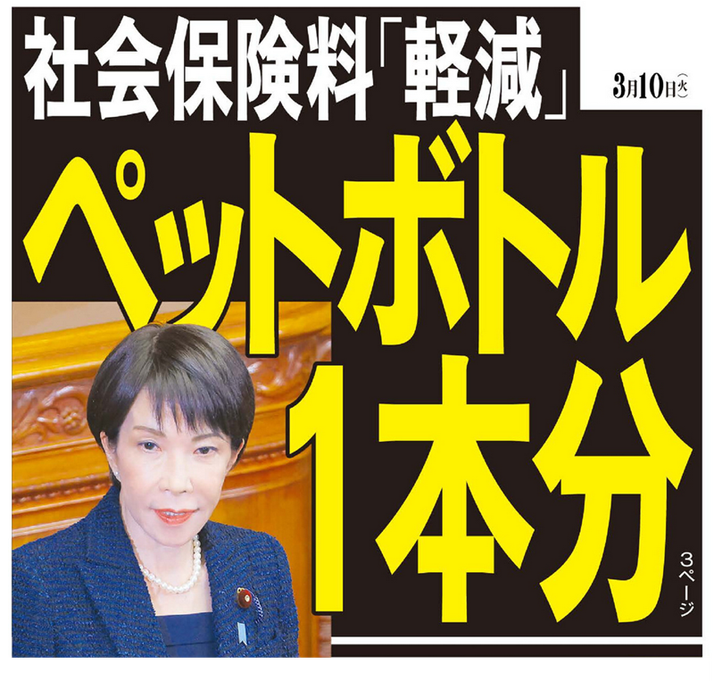 「社会保障制度改革を推進し、手取りを増やす上でも重要だ」──。2日の衆院予算委員会で、高市首相は社会保険料の引き下げについて問われ、こう意欲を見せた。しかし、政権が訴える「保険料の負担軽減」は、1カ月あたりペットボトル1本分に過ぎないのが実態だ。スズメの涙ほどの負担減と引き換えに、万が一に備えた保険給付を大幅に削ろうとしている。