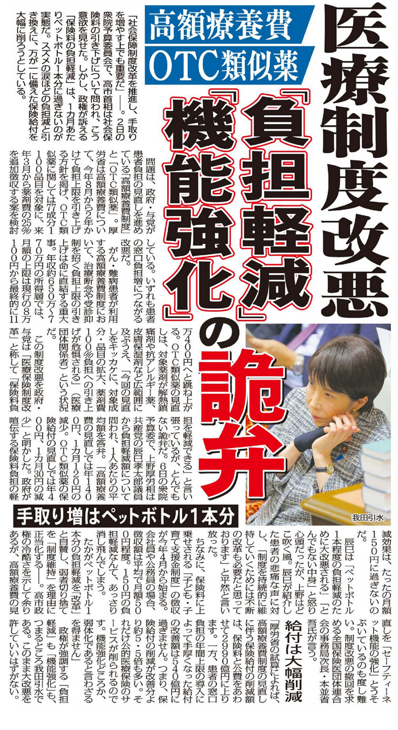 政権が強調する「負担軽減」も「機能強化」も、つまるところ我田引水である。このまま大改悪を許していいはずがない。