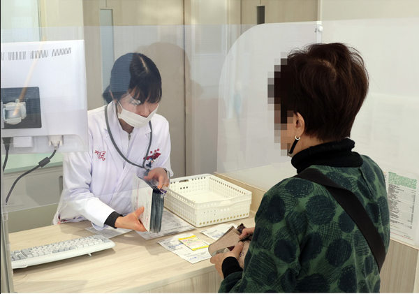 ペットボトル1本分の軽減のために、大改悪される(薬局で湿布薬を受け取る患者) (C)山陽新聞/共同通信イメージズ
