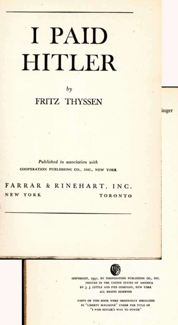 ドイツの鉄鋼トラスト、合同製鋼の会長を務めた実業家で、ナチ党を支援していたものの、1930年代後半からナチを批判するようになったフリッツ・ティッセンは1941年、『私はヒトラーに支払った』という本を表している。