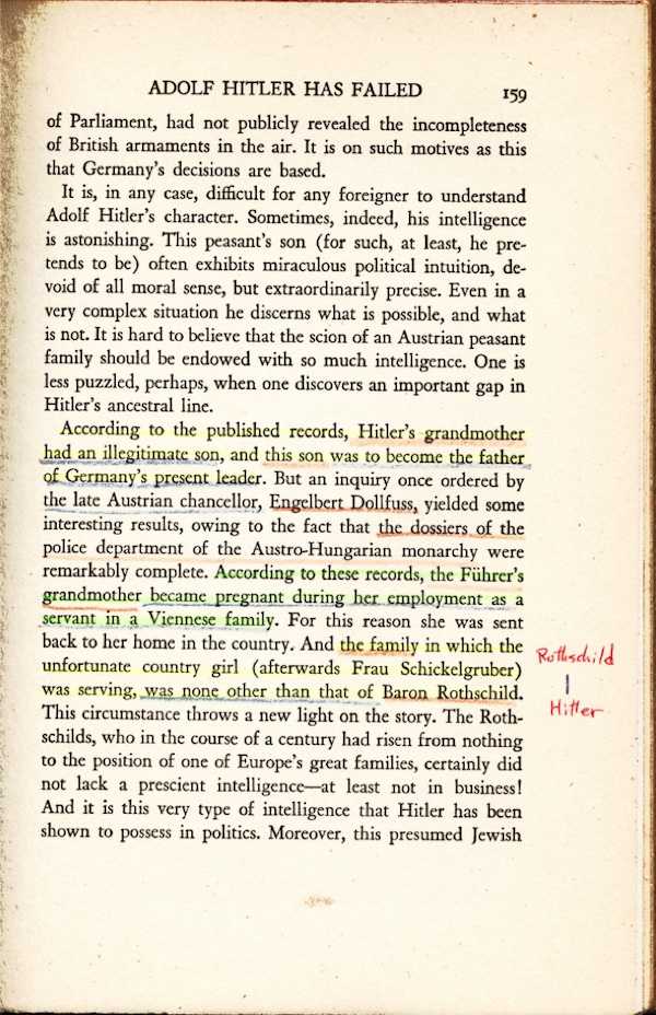 それによると、ヒトラーの祖母はウィーンの家族に召使として雇われていたのだが、その際に妊娠、故国へ戻ってヒトラーの父親を産んだという。祖母が働いていたのはロスチャイルド男爵の家にほかならないとされている。