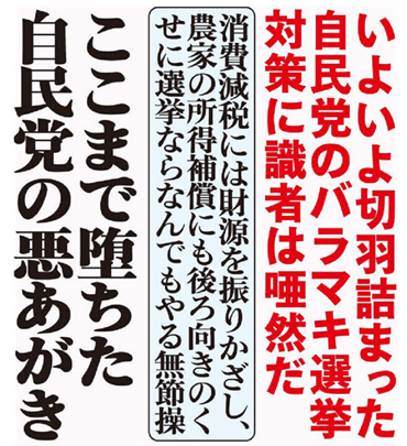 いよいよ切羽詰まった自民党のバラマキ選挙対策に識者は唖然だ。消費減税には財源を振りかざし、農家の所得補償にも後ろ向きのくせに選挙ならなんでもやる無節操。ここまで堕ちた自民党の悪あがき。