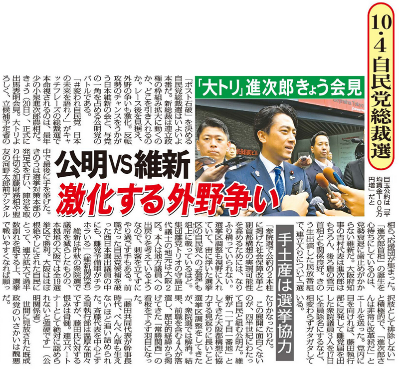 総裁選後見据え“外野争い”が激化…「進次郎首相」誕生心待ちの維新に公明は恨み骨髄
