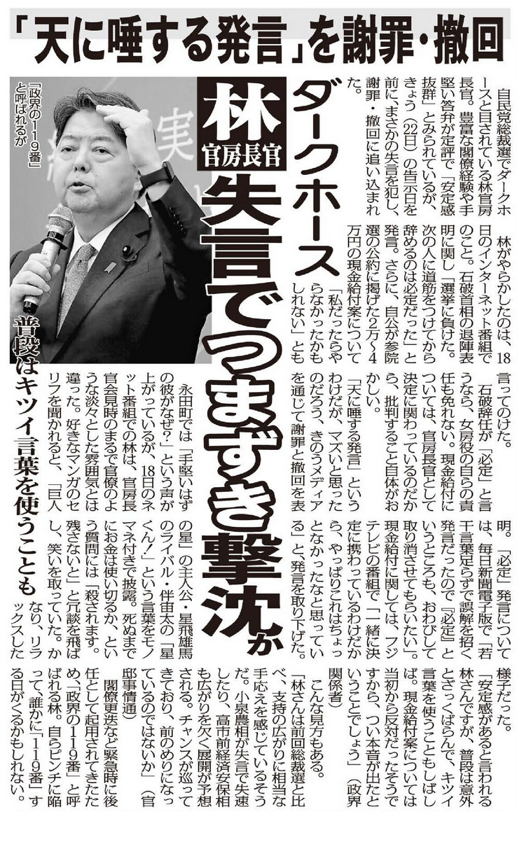 自民党総裁選でダークホースと目されている林官房長官。豊富な閣僚経験や手堅い答弁が定評で「安定感抜群」とみられているが、22日の告示日を前に、まさかの失言を犯し、謝罪・撤回に追い込まれた。