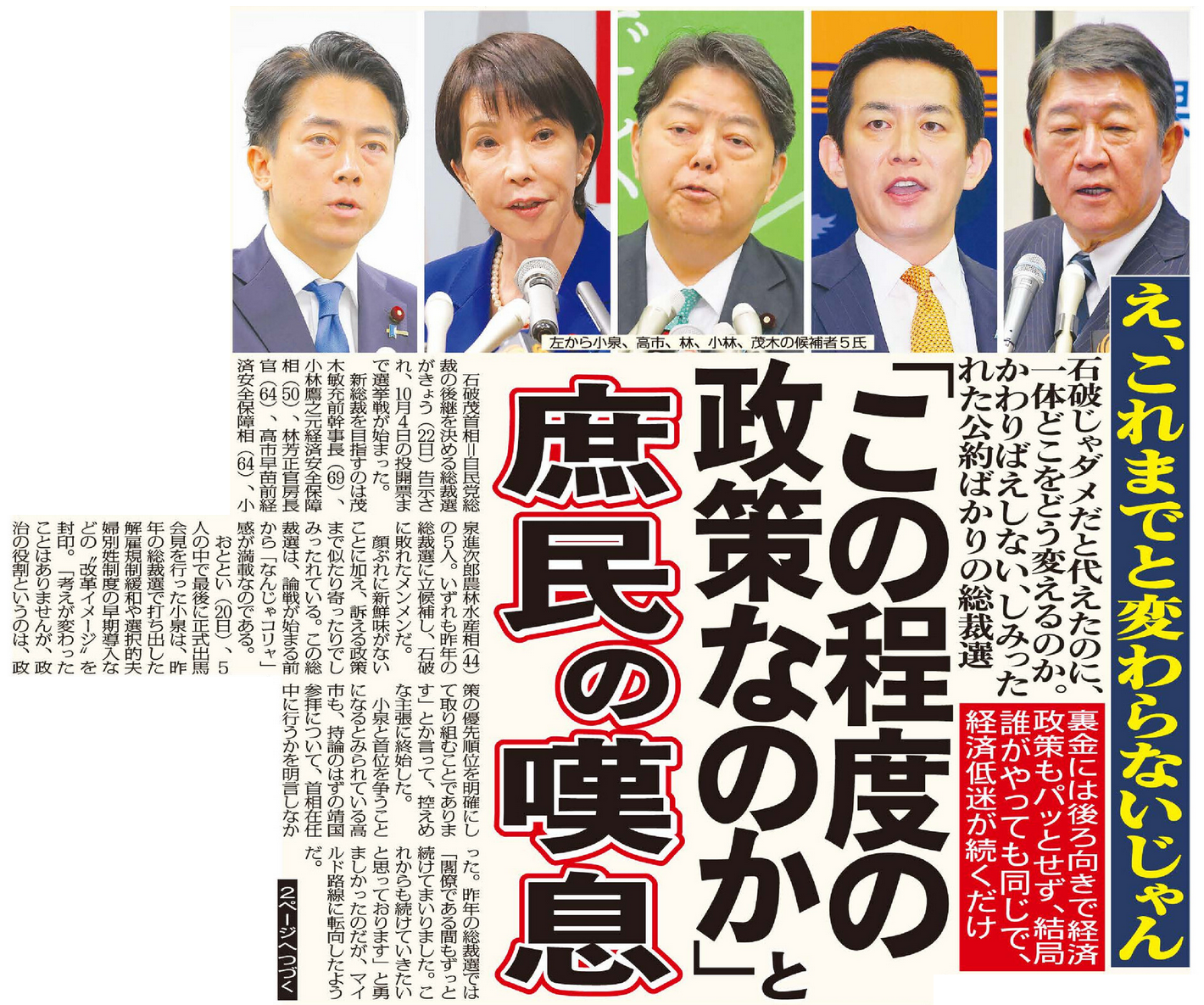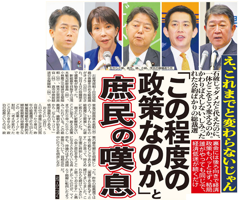 顔ぶれに新鮮味がないことに加え、訴える政策まで似たり寄ったりでしみったれている。この総裁選は、論戦が始まる前から「なんじゃコリャ」感が満載なのである。