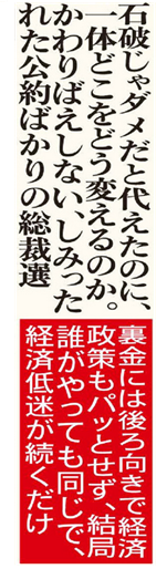 石破じゃダメだと代えたのに、一体どこをどう変えるのか。かわりばえしない、しみったれた公約ばかりの総裁選。裏金には後ろ向きで経済政策もパッとせず、結局誰がやっても同じで、経済低迷が続くだけ。