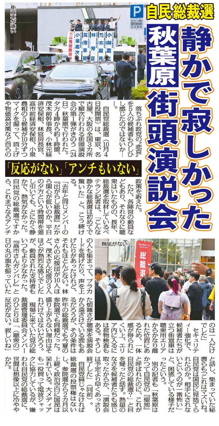 「去年と同じメンバーの『出がらし総裁選』だから関心が低いのか、平日の夕方という時間帯を差し引いても、とにかく静かで、熱気がなかった。自民党の総裁選ですから、これまでならアンチの人も集まって、プラカードを掲げたり、声を上げたりがあったけれど、それもほとんどない。林さんの応援団が10人ほど、茂木さん応援の3人ほどが熱烈な感じでしたが、動員された支持者もいつもより少なかった。『高市さんガンバレ』と日の丸の旗を振っていたのは一人だけでした」