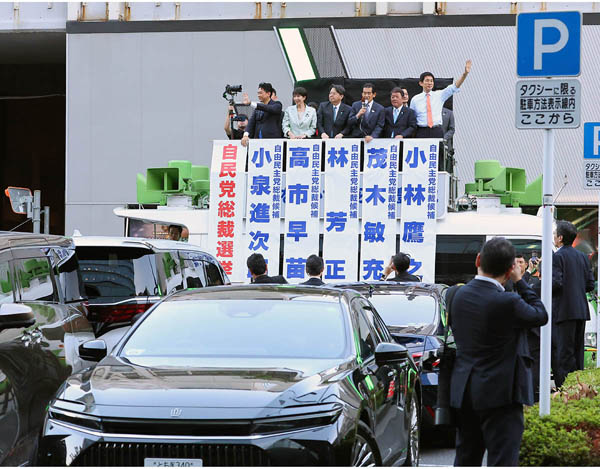 自民党総裁選(10月4日投開票)は、東京、名古屋、大阪の全国3カ所で順次行われる街頭演説会の第1弾が24日秋葉原で行われた。夕方4時から約1時間、茂木前幹事長、小林元経済安保相、林官房長官、高市前経済安保相、小泉農相の5候補が10分ずつマイクを握って、賃上げや物価高対策など自らの政策を訴えた。