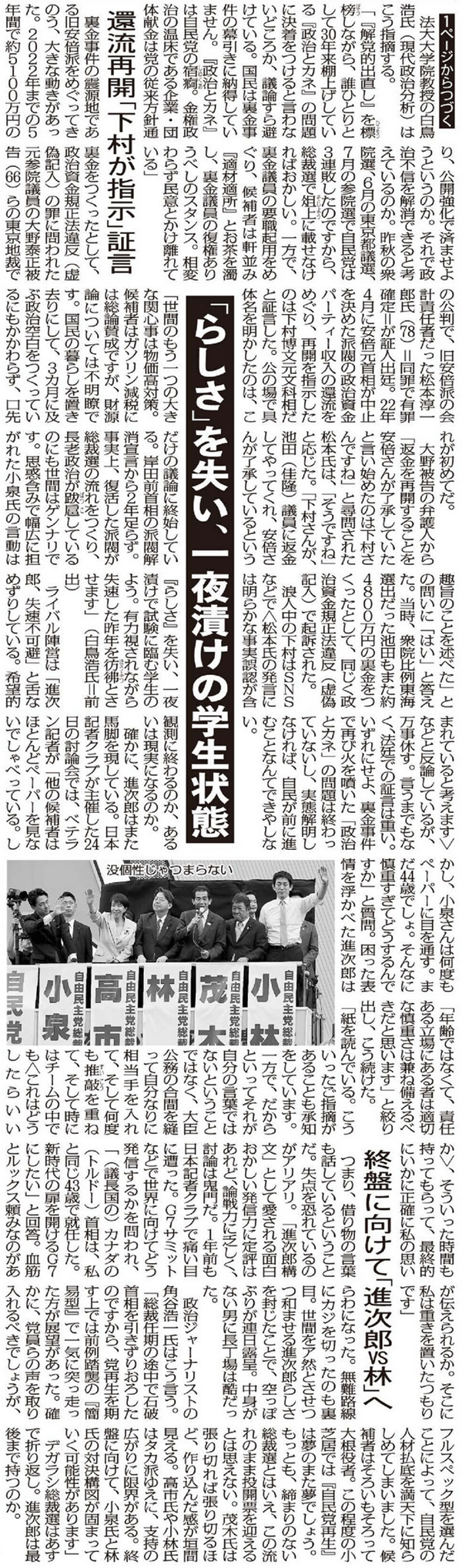「世間のもう一つの大きな関心事は物価高対策。候補者はガソリン減税には総論賛成ですが、財源論については不明瞭です。国民の暮らしを置き去りにして、3カ月に及ぶ政治空白をつくっているにもかかわらず、口先だけの議論に終始している。岸田前首相の派閥解消宣言から2年足らず。事実上、復活した派閥が総裁選の流れをつくり、長老政治が跋扈しているのにも世間はゲンナリです。思惑含みで幅広に担がれた小泉氏の言動は『らしさ』を失い、一夜漬けで試験に臨む学生のよう。有力視されながら失速した昨年を彷彿とさせます」(白鳥浩氏=前出)