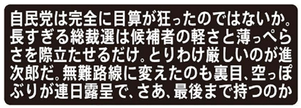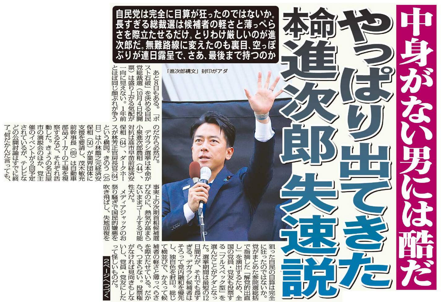 自民党は完全に目算が狂ったのではないか。長すぎる総裁選は候補者の軽さと薄っぺらさを際立たせるだけ。とりわけ厳しいのが進次郎だ。無難路線に変えたのも裏目、空っぽぶりが連日露呈で、さあ、最後まで持つのか。