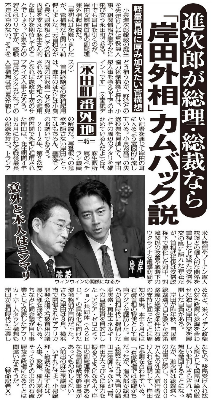 小泉進次郎総裁の誕生を先走りした党役員人事、組閣情報が賑やかに飛び交う永田町である。中でも耳目を引くのが、岸田文雄前首相の副総理兼外相起用説だ。