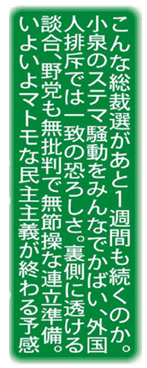 “共犯者”が皆で口をつぐむ。大マスコミも右に倣えで、終わったことにしてしまう。かくて、日本社会にあって、自民党総裁選だけが「異空間」を形成しているのだが、その「異空間」で選ばれた総裁がおそらく首相になるであろう「倒錯」。異様というか醜悪というか、薄気味悪くなってくるのである。