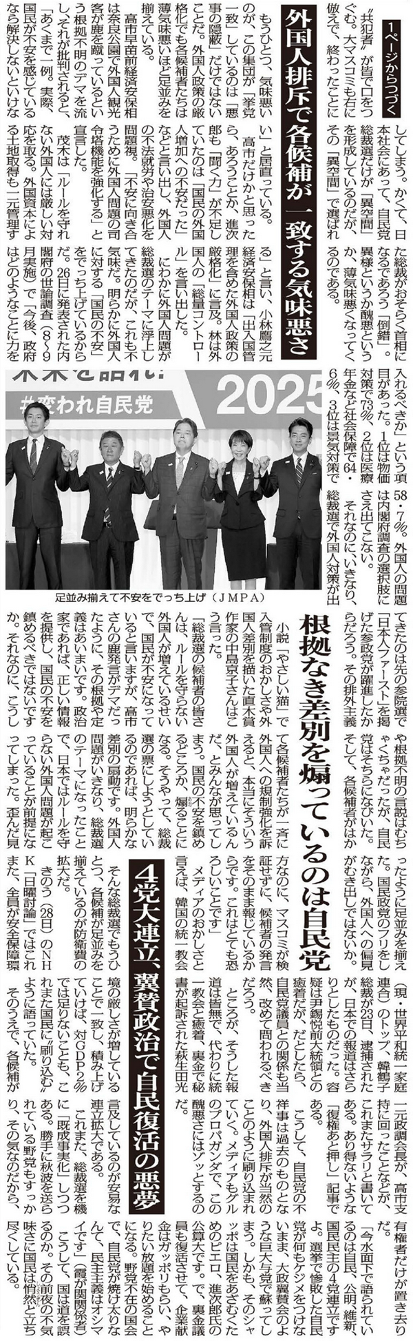 それなのに、いきなり、総裁選で外国人対策が出てきたのは先の参院選で「日本人ファースト」を掲げた参政党が躍進したからだろう。その排外主義や根拠不明の言説はむちゃくちゃだったが、自民党はそちらになびいた。そして、各候補者がはかったように足並みを揃えた。国民政党のフリをしながら、外国人への偏見がむき出しではないか。