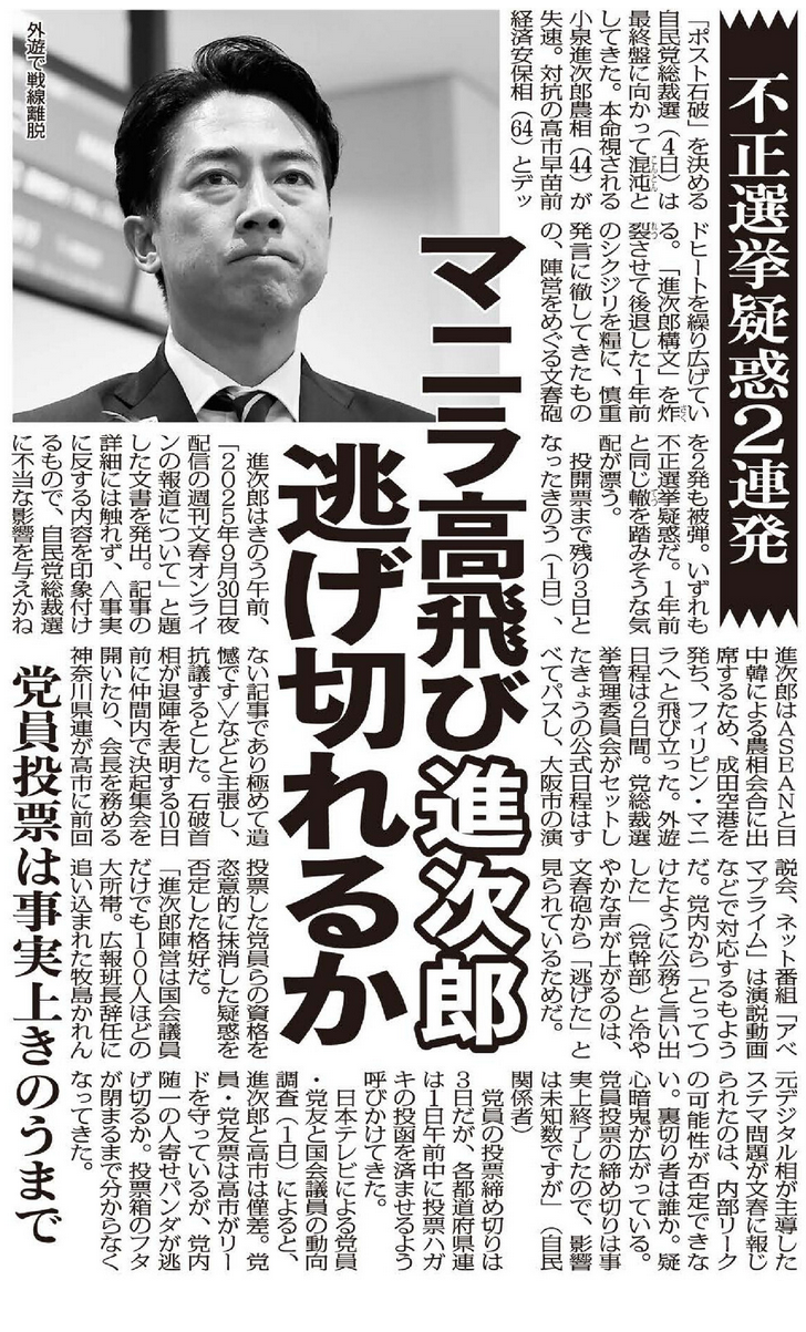 自民党の党勢を回復できるのは高市早苗しかいないのになんで進次郎なのか意味不明だよ。(大笑) 15. たぬき和尚[2337] gr2CyoKrmGGPrg 2025年10月04日 05:17:59 : ZGAvq8lUL6 : RGlkdUxULi93MEE=[1853] 報告 ▲△▽▼ 進次郎も高市も自滅だよ。総理は林だ。私はそう思う。 あべぴょんの最終殲滅は地元山口で長年のライバルだった林が総理になることだ。 これで悪魔的な清和会は完膚なきまで叩き潰される。かつての田中派のように。 盛者必衰のことわりだ。諸行無常だ。 あべぴょん勢力を再興しようとしている半島壺やキリストの幕屋とその仲間のだいだい色は潔くあきらめることだ。 16. ぷぴぴぷ[87] gtWC0oLSgtU 2025年10月04日 07:18:14 : zZkFCTHhHQ : THlHU3lYdnFmaGM=[40] 報告 ▲△▽▼ 、 林はダメだろう 高市も無理だ。 選挙の顔にならない。 自民党は年内には選挙 やるんじゃないのか。 与党にしがみつきたいわけだし 何としても 過半数越えを狙うだろう。 そのために国民のご機嫌取りの政策を 心にもない一時的な 国民 ファースト 政策で支持率を回復しながら選挙選。 それを考えると選挙の顔にするのに進次郎 なんだろう。 マスコミは8又で不倫を隠し、兄の幸太郎のテレビ露出を増やしてのイメージ 戦略で自民党に大応援してるわけだから、脚本はすでに出来上がっているのだろう。 大事なことは一つしかない。 腐った政党に二度と 金輪際 二度と 過半数を与えないことだ。 立憲の出している給付付き定額控除は中身を最近知ったが非常に優れている。 発信力がなく下手くそだから支持が広がらないのだろう。 中身を再建した大学教授たちも次々と 大賛成 と絶賛し始めた。 **両院で過半数割れをしなければ国民生活を全く無視の自民党 二度と 絶対に二度と 一生涯 二度と 過半数を与えてはならない。 。 17. ぷぴぴぷ[89] gtWC0oLSgtU 2025年10月04日 07:51:09 : zZkFCTHhHQ : THlHU3lYdnFmaGM=[42] 報告 ▲△▽▼ 、 麻生太郎もいい加減いらないだろう。 妾が2人いて それぞれにお店を持たせているのが週刊誌に掲載。 手当としてなんだろう 一晩で400万円の伸び代を支払っている 先日 麻生セメントで作業員が死亡した。 マスコミはほんの 4〜5秒程度しか 報道しない。 進次郎の八又不倫も小泉家が稲川会 ヤクザ土建 だということも報道しない。 CSISの飼い犬でグリーンの弟子だから日本人と日本を捨てる。 こんなの 支持率が高いように 八百長 合戦をしてるわけだから 騙されている国民も情けない。 ただここまで 日本が落ちぶれ 物価も 激増し 国民は過去のように 単純には騙されないのは ある意味 良いが 裏の顔を知らないで国民や参政党に騙されているのだから 国民も腐ってるのかな。 まともな市民政党が2つぐらい出てきて 躍進してもらわないと困ったものだ。 選挙の顔にして兄 孝太郎のテレビ イメージ戦略も利用し 支持率を上げたら 年末までに 選挙に突入するんだろう。 進次郎で脚本が全て出来上がってるんじゃないのか??? 。 18. 宮島鹿センベイ(禁)[6] i3uTh46tg1qDk4N4g0OBaYvWgWo 2025年10月04日 08:18:55 : jghJ9E1ll6 : cHVyZEN3QzVLRm8=[2] 報告 ▲△▽▼ マニラ? 高跳び? トンズラ? どちらの親分さんで? 19. 打倒タブセ林コイズミ[6] kcWTfINeg3WDWpfRg1KDQ4NZg34 2025年10月04日 08:58:22 : XgeYiV1tnA : SEx6V3hXZk92Lk0=[3308] 報告 ▲△▽▼ <△20行くらい> >投稿者 赤かぶ 日時 2025 年 10 月 04 日 01:05:05: >2025/10/02 日刊ゲンダイ >日刊ゲンダイDIGITAL > 政治・社会 > 政治ニュース > 記事 > 小泉進次郎氏は逃げ切れるか? 自民党総裁選で不正疑惑2連発、とってつけたような公務でマニラへ“高飛び” 公開日:2025/10/02 10:20 更新日:2025/10/02 10:20 きょう(令和7年2025/10/04(土):半ドン)の「総合 アクセス数ランキング(瞬間)令和7年2025/10/04 09:01更新」のトップ記事は、いつもの 2日前の、 日刊ヒョンデ、いや日刊ヒュンダイ、いや日刊ゲンダイ の、 コレですか。 >石破首相が退陣を表明する10日前に仲間内で決起集会を開いたり、会長を務める神奈川県連が高市に前回投票した党員らの資格を恣意的に抹消した疑惑 日刊ゲンダイは、シャイン・マスカット問題や、ステマ疑惑には触れないんですね・・・ >党員の投票締め切りは3日だが、各都道府県連は1日午前中に投票ハガキの投函を済ませるよう呼びかけ しかし、大阪の「演説会」は、2日・・・ 大阪の党員(府議会議員など)は、投票ハガキの投函は「演説会」の前にしなければならない・・・ 地方切り捨て選挙ですね。 東京(永田町)一極支配の自民党は、変われるか? 大阪の全敗(衆議院も参議院も)問題が解決できるか?? ??? 20. 打倒リクード山田宏[15] kcWTfIOKg06BW4NojlKTY41H 2025年10月04日 09:04:56 : XgeYiV1tnA : SEx6V3hXZk92Lk0=[3309] 報告 ▲△▽▼ >>19