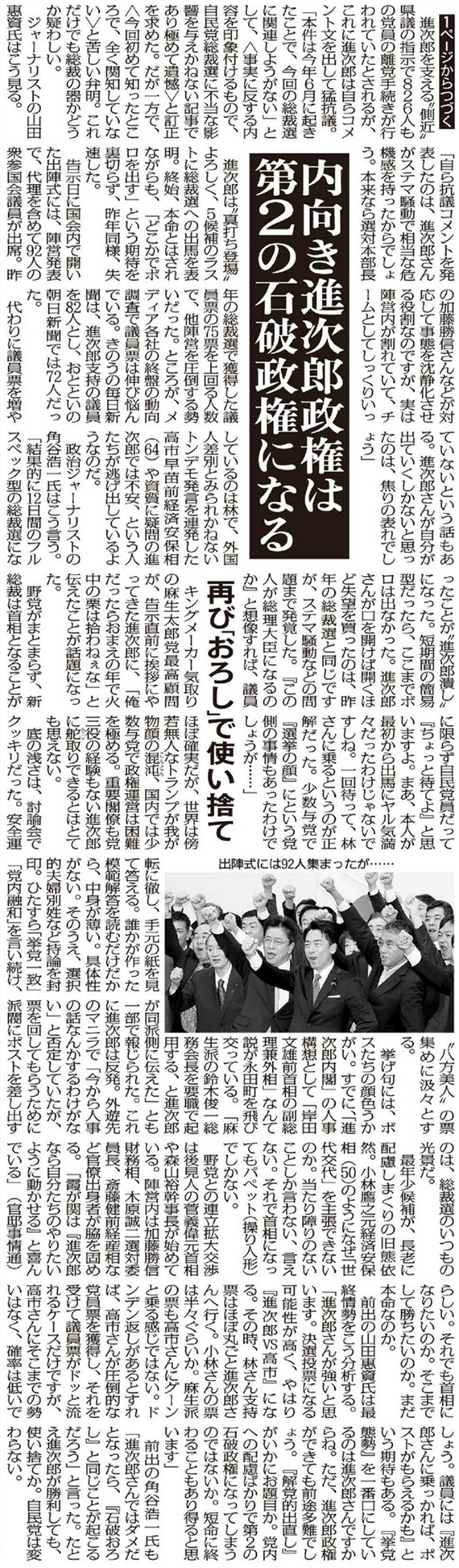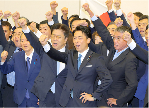 告示日に国会内で開いた出陣式には、陣営発表で、代理を含めて92人の衆参国会議員が出席。昨年の総裁選で獲得した議員票の75票を上回る人数で、他陣営を圧倒する勢いだった。ところが、メディア各社の終盤の動向調査で議員票は伸び悩んでいる。きのうの毎日新聞は、進次郎支持の議員を82人とし、おとといの朝日新聞では72人だった。