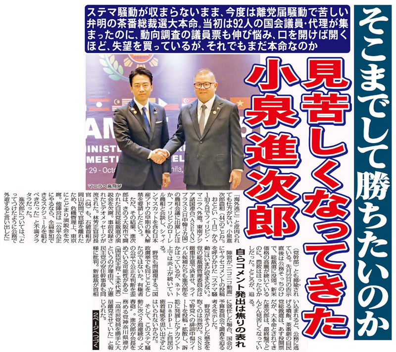 進次郎については、「とってつけたように公務で外遊すると言い出した」(党幹部)とも揶揄されている。先月22日の告示直後は公務そっちのけで、総裁選に没頭。新米価格の高騰が続いているのに、農政はほったらかしだった。ところが、追い込まれると、公務に逃げる噴飯。茶番劇の自民党総裁選は、あす投開票だが、大本命とされてきた進次郎は、最終盤でどんどん見苦しくなっている。