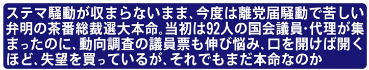 ステマ騒動が収まらないまま、今度は離党届騒動で苦しい弁明の茶番総裁選大本命。当初は92人の国会議員・代理が集まったのに、動向調査の議員票も伸び悩み、口を開けば開くほど、失望を買っているが、それでもまだ本命なのか。
