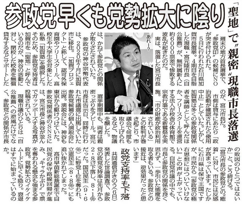 参政党の党勢拡大に早くも陰り…「聖地」加賀市で“親密”現職市長が惨敗落選の波乱