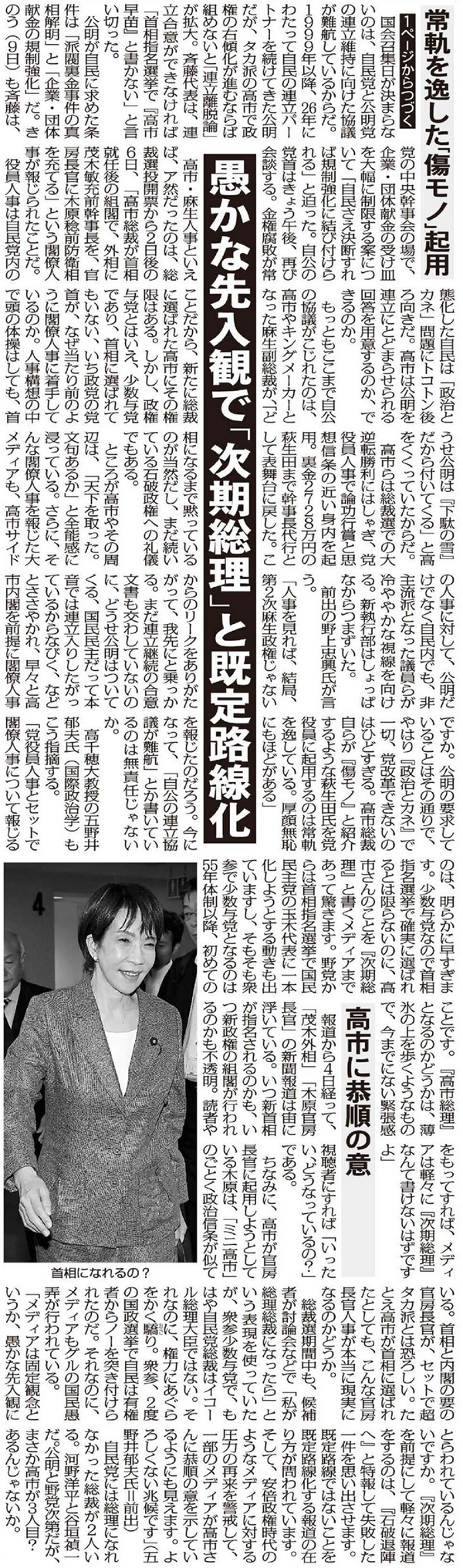 「党役員人事とセットで閣僚人事について報じるのは、明らかに早すぎます。少数与党なので首相指名選挙で確実に選ばれるとは限らないのに、高市さんのことを『次期総理』と書くメディアまであって驚きます。野党からは首相指名選挙で国民民主党の玉木代表に一本化しようとする動きも出ていますし、そもそも衆参で少数与党となるのは55年体制以降、初めてのことです。『高市総理』となるのかどうかは、薄氷の上を歩くようなもので、今までにない緊張感をもってすれば、メディアは軽々に『次期総理』なんて書けないはずですよ」