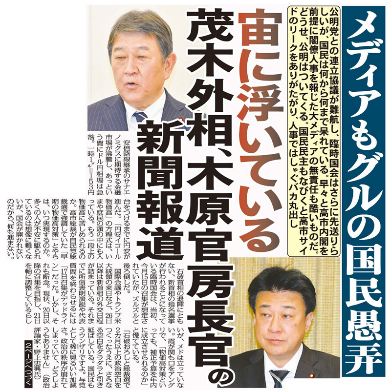 報道から4日経って、「茂木外相」「木原官房長官」の新聞報道は宙に浮いている。いつ新首相が指名されるのかも、いつ新政権の組閣が行われるのかも不透明。読者や視聴者にすれば「いったい、どうなっているの?」である。